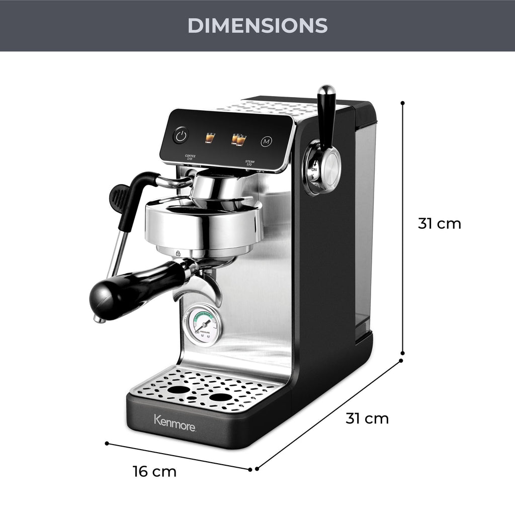 With a detachable 1.2L transparent water tank and intuitive touch panel controls for single, double or manual shots, the Kenmore Dualis is designed for reliable daily espresso performance