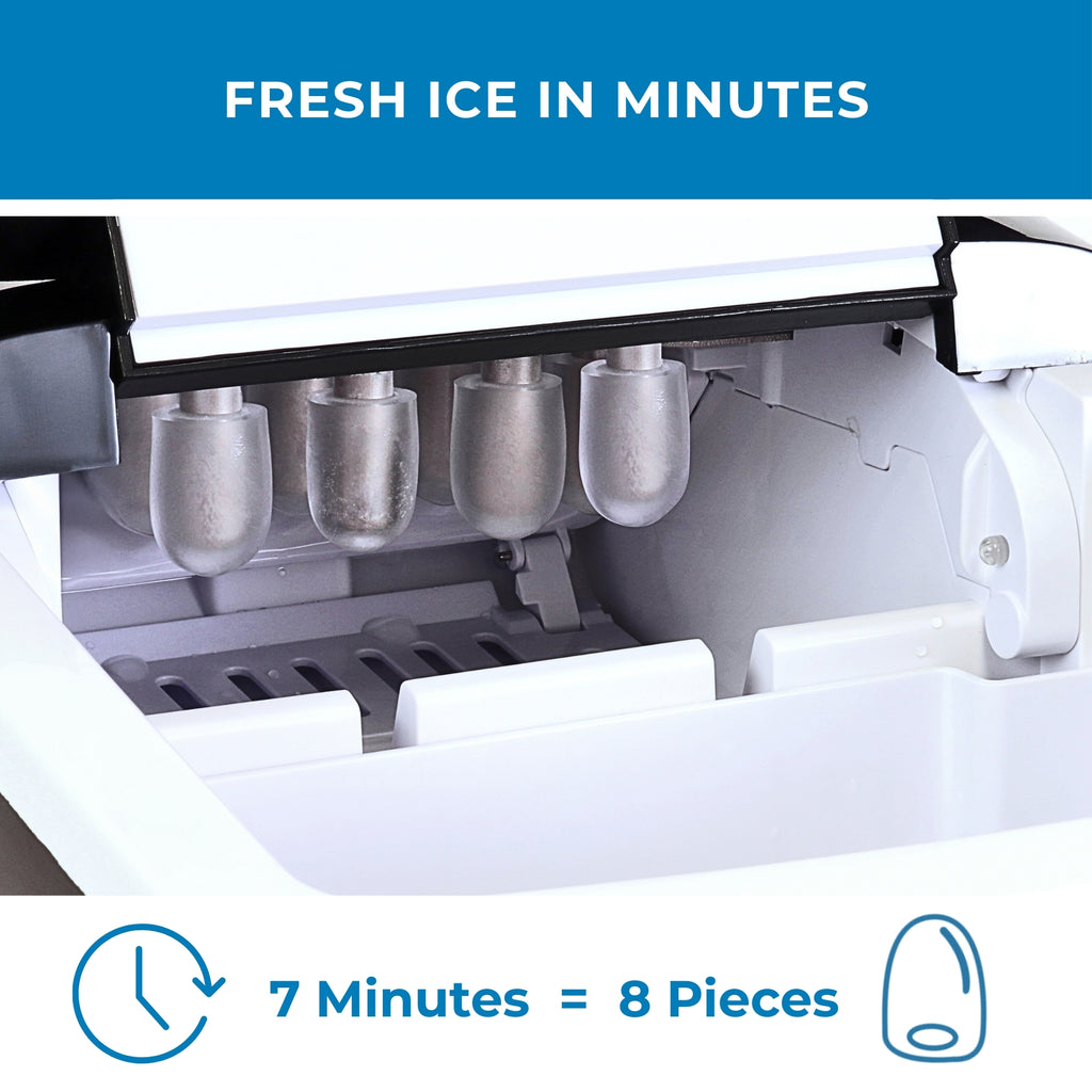 - 6 Minutes Fast Ice-Making: Powerful compressor cooling technology means this automatic ice making machine will produce your first set of 9 bullet-shaped ice cubes in just 6 minutes.